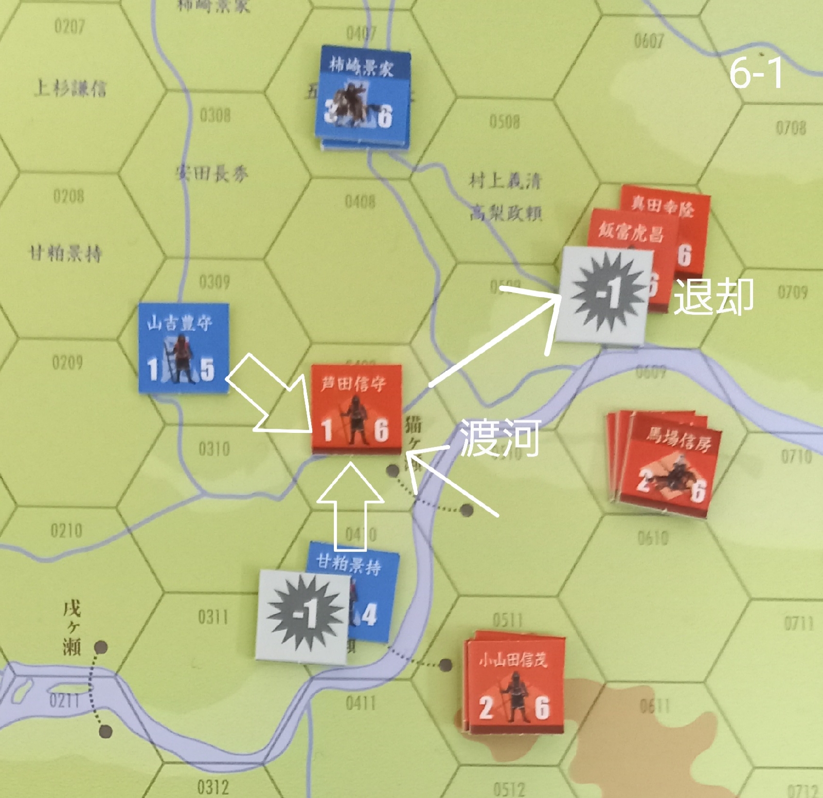 今回も、もし第2ターンの第2フェイズに《山本勘助》マーカーを投入し、さらに先攻を取れば、信繁隊も渡河に成功していた。